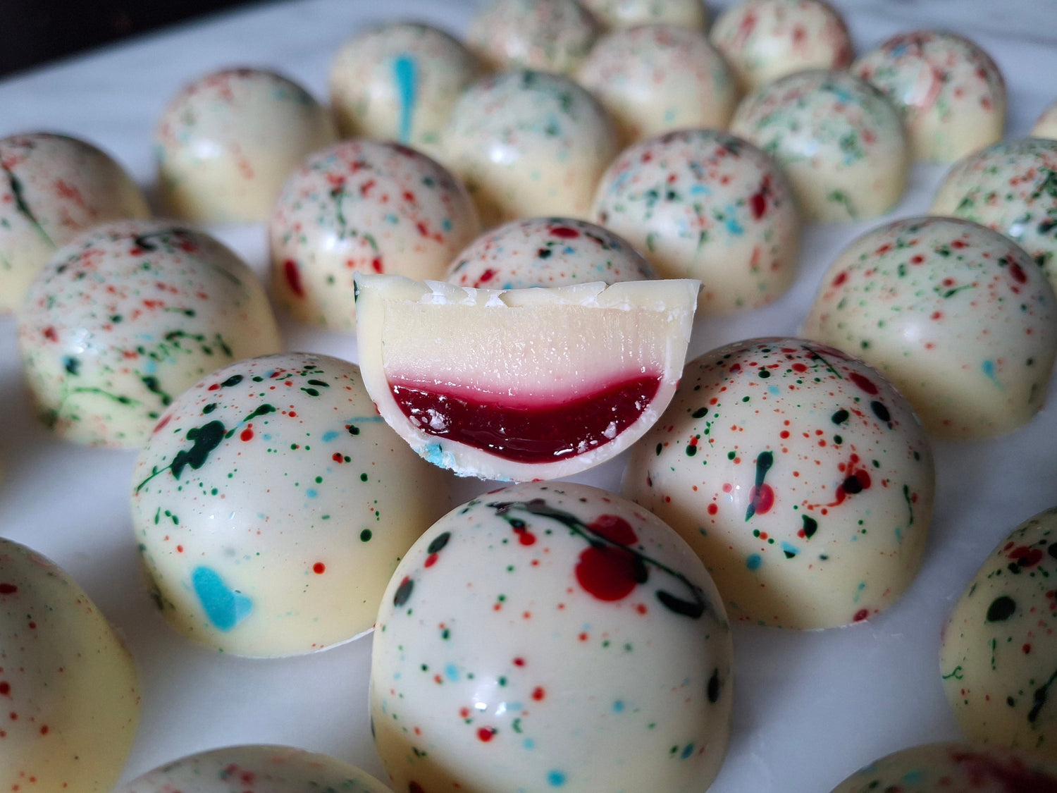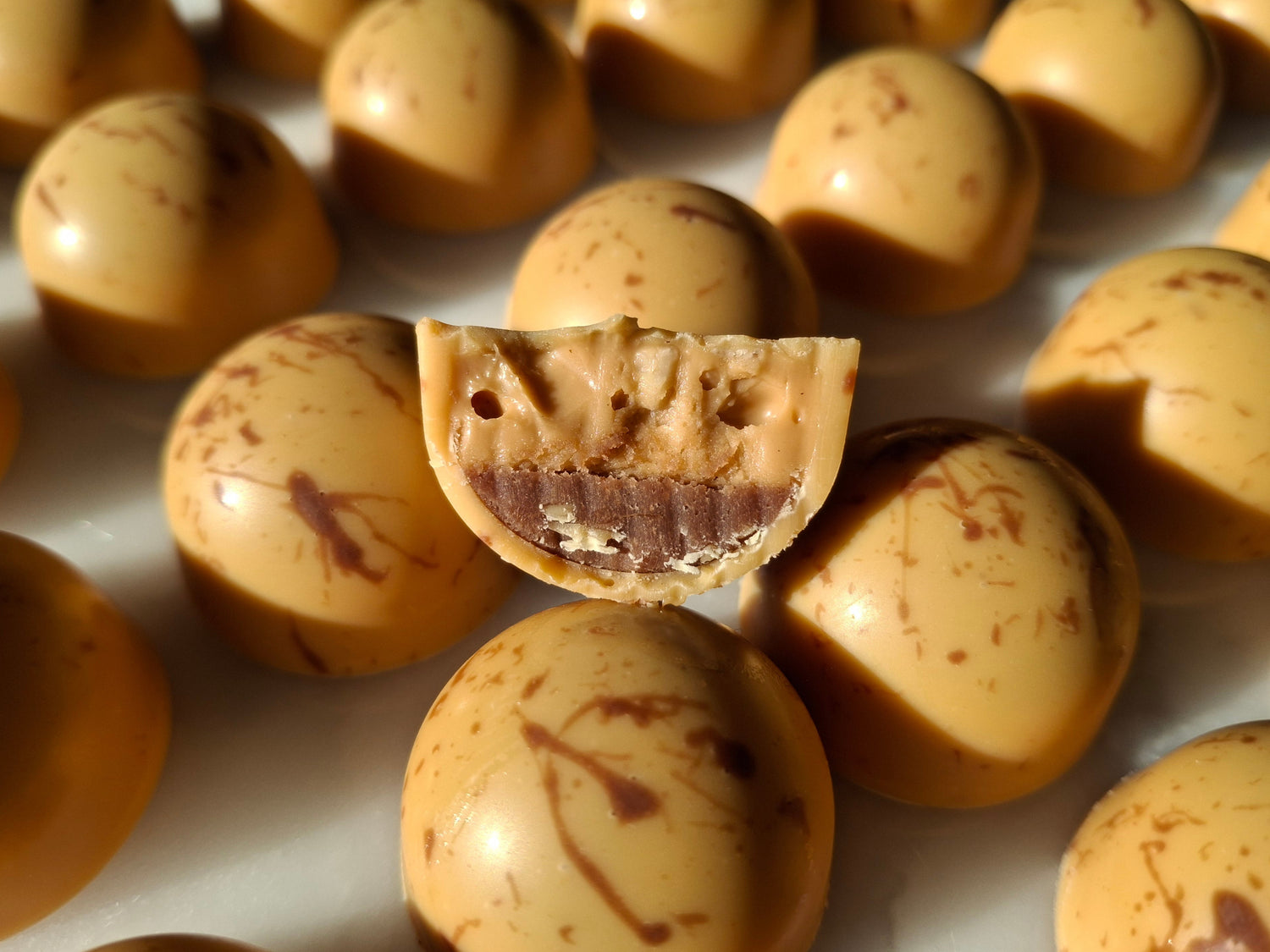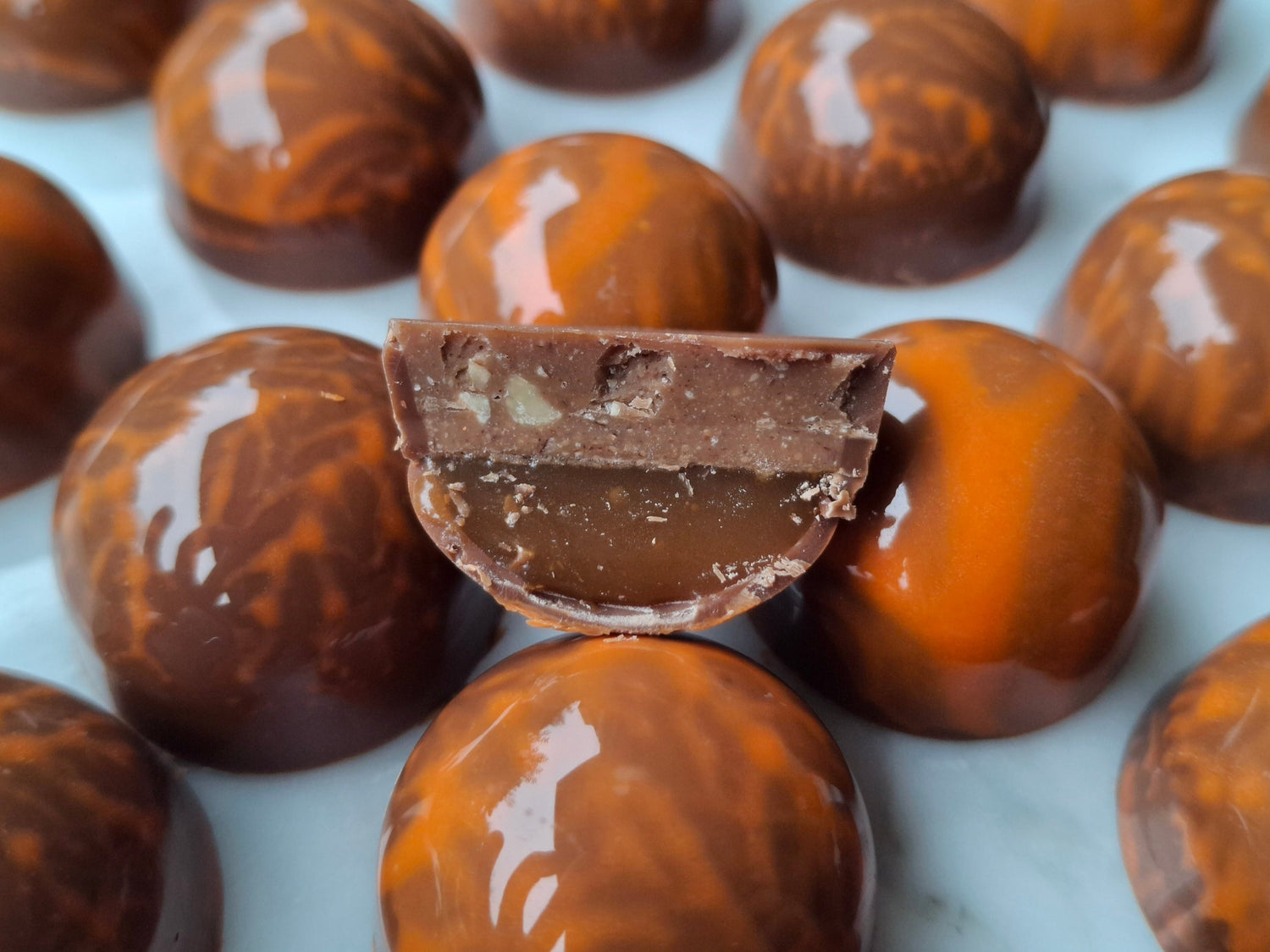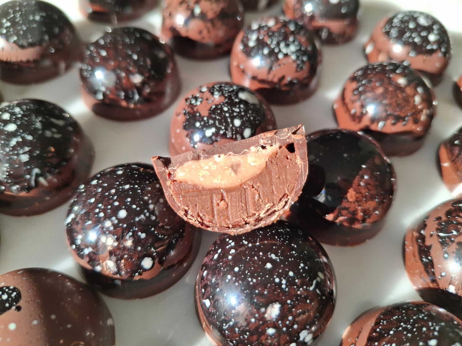 Da es sich bei den Pralinés um Unikate handelt, sieht keines aus, wie das andere. Es kann auch vorkommen, dass die farbliche Gestaltung oder das Design des Pralinés sich verändert.